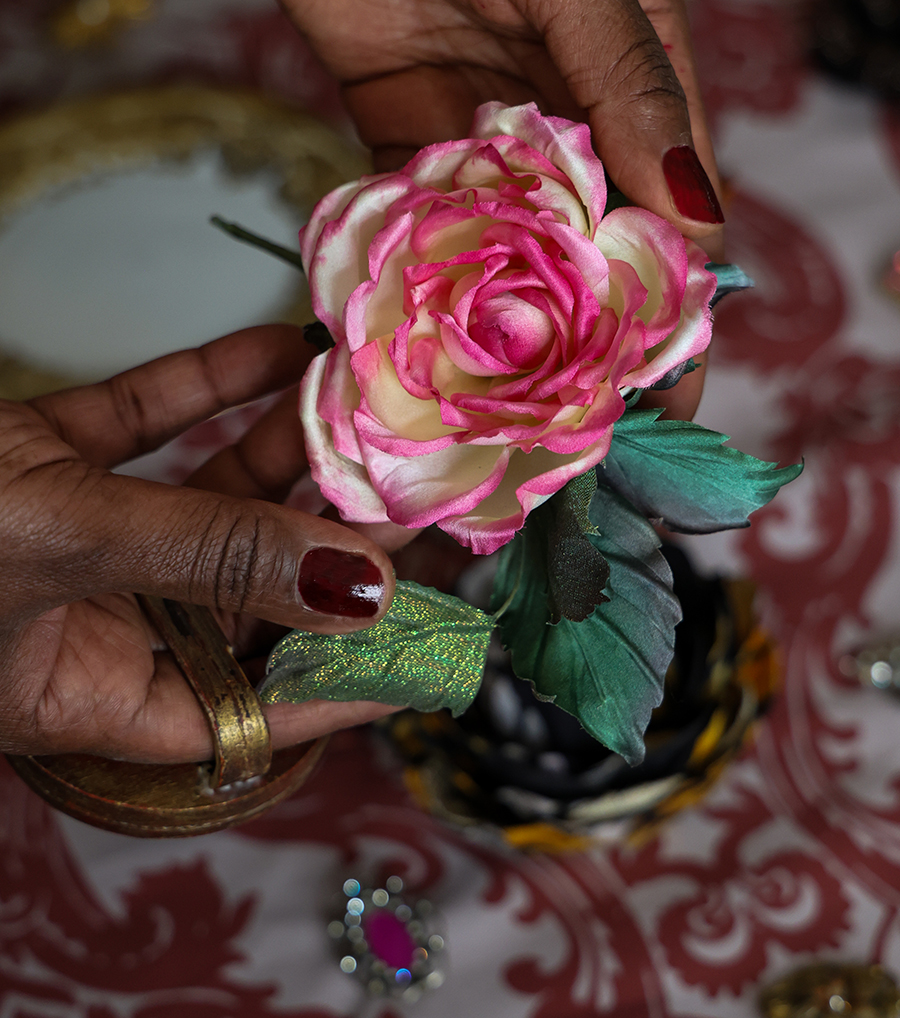 Elizabeth combines traditional and modern techniques including using Victorian moulds and laser cutting into the fabric surface. She uses antique hand printed fabrics, African Wax print fabrics hand printed in Ghana, and can create customised fabric flowers from fabrics with special meaning to clients.